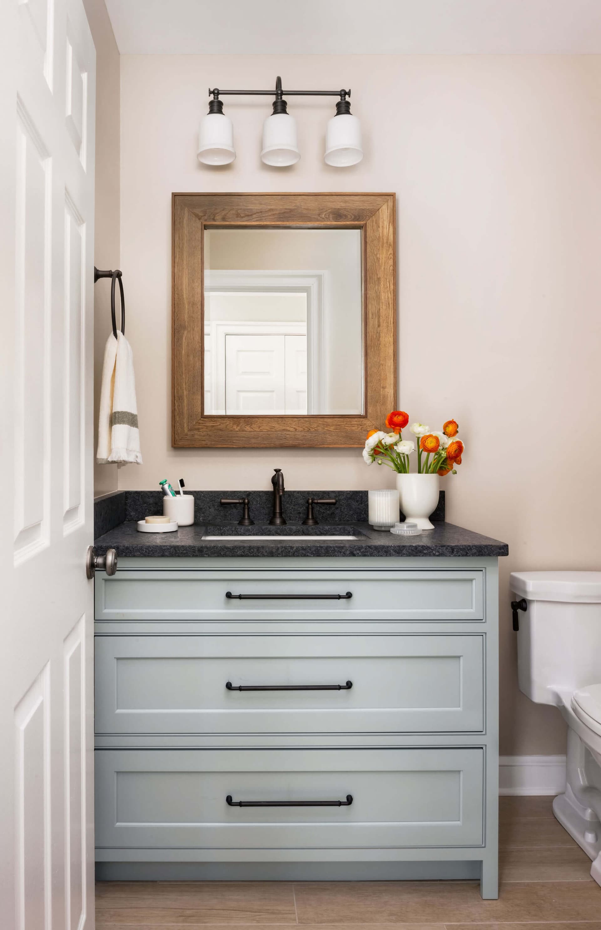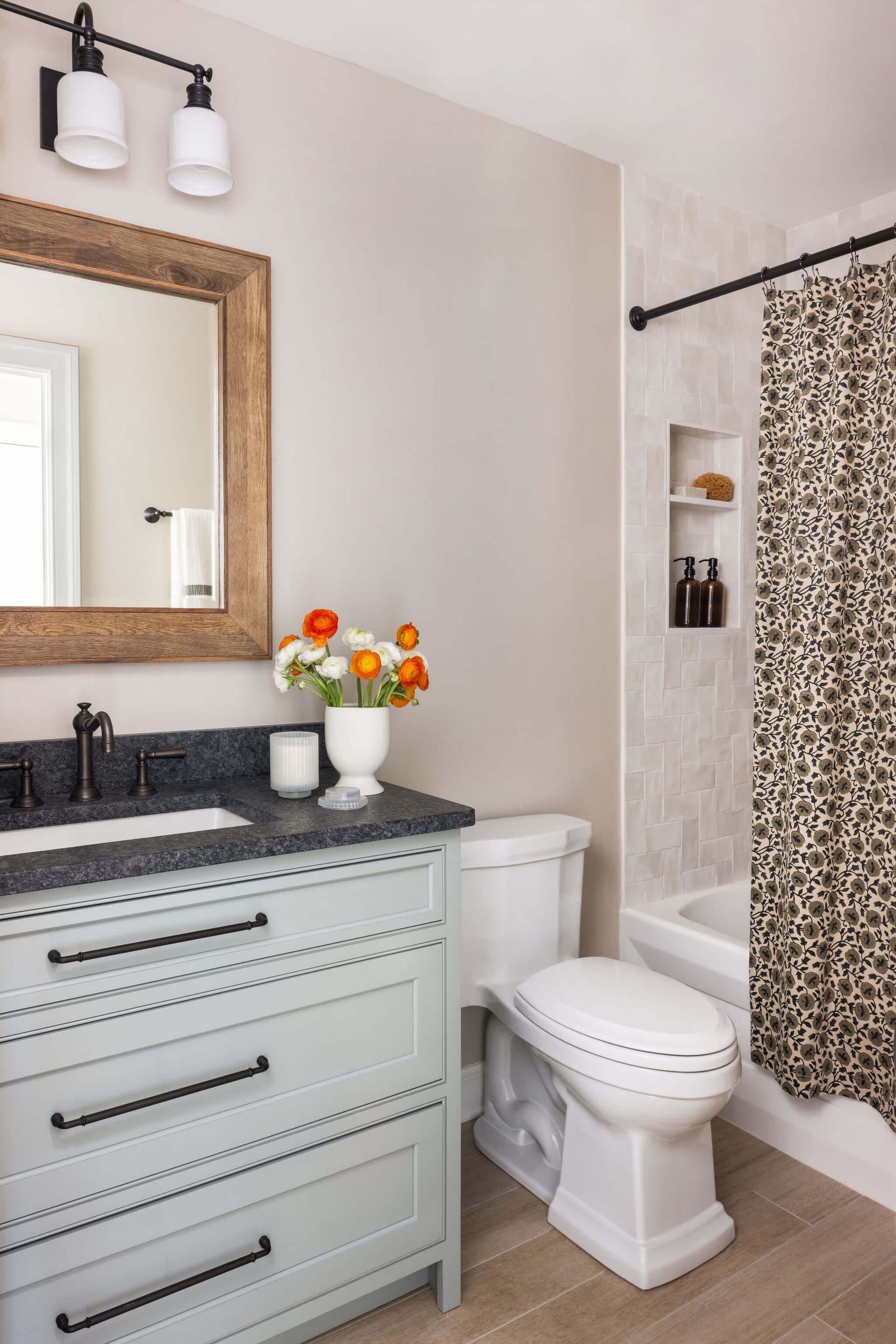 The third bath is a guest bath that pairs warm, modern charm with timeless materials. The soft green vanity and leathered stone countertop are contrasted by the vintage-style faucet. A rustic wood-framed mirror and classic sconces add character, while creamy neutral wall tile wrap the tub surround.