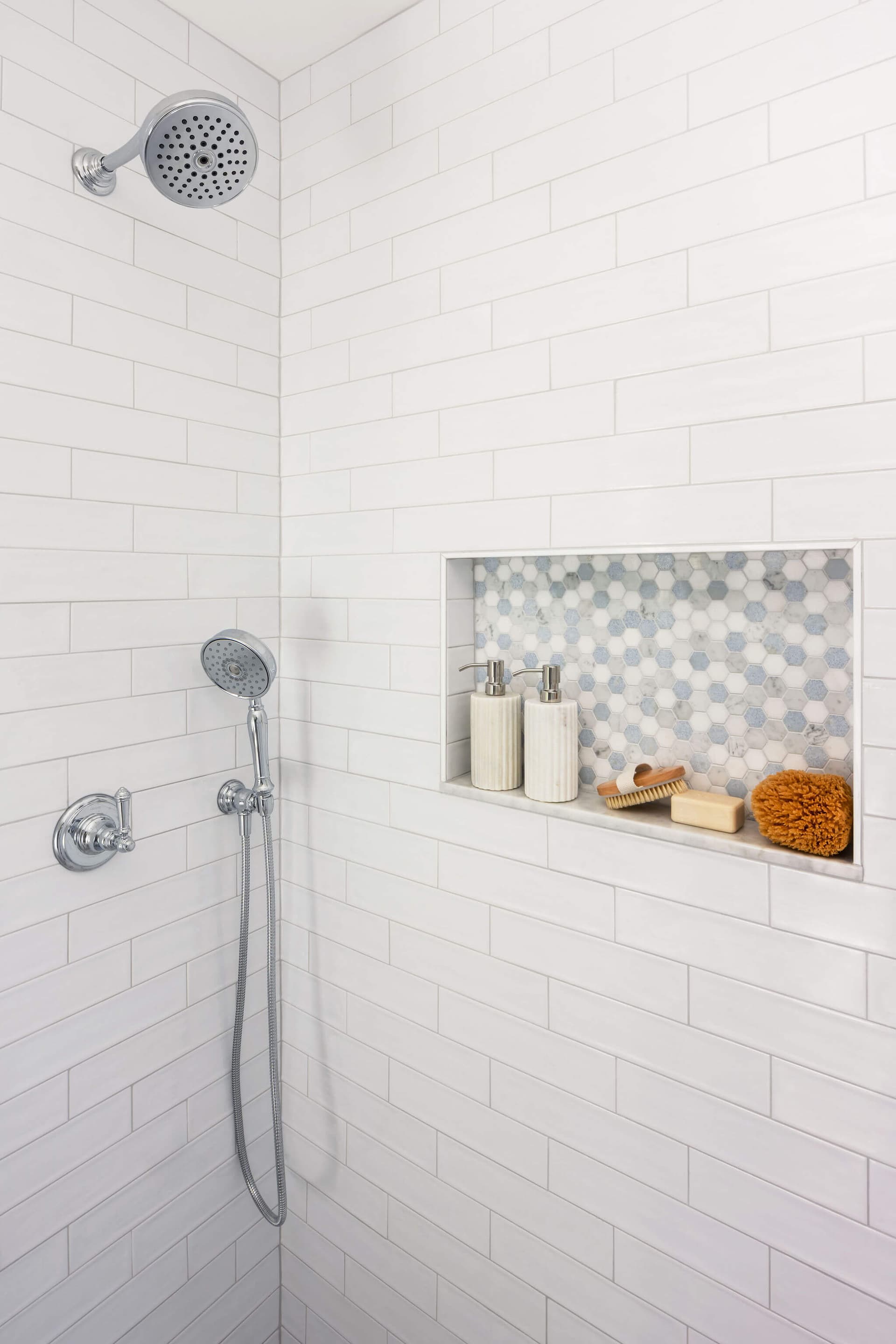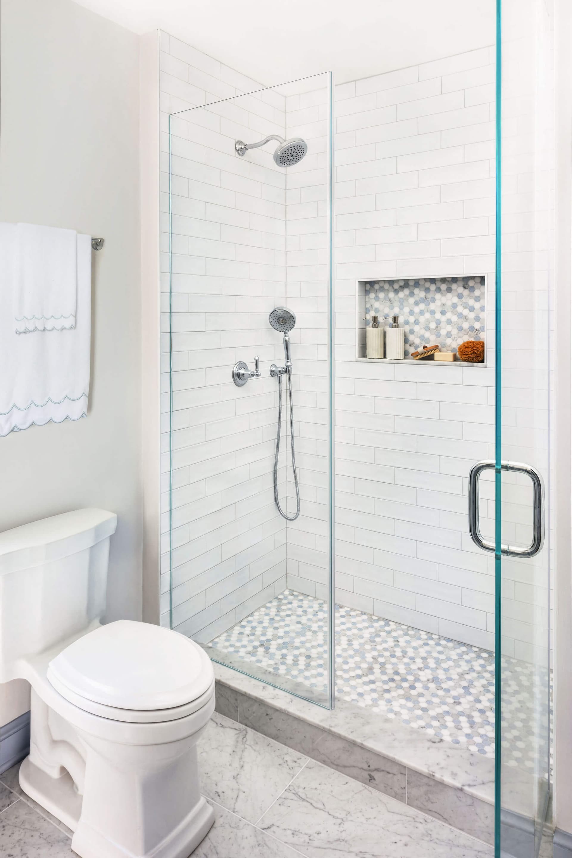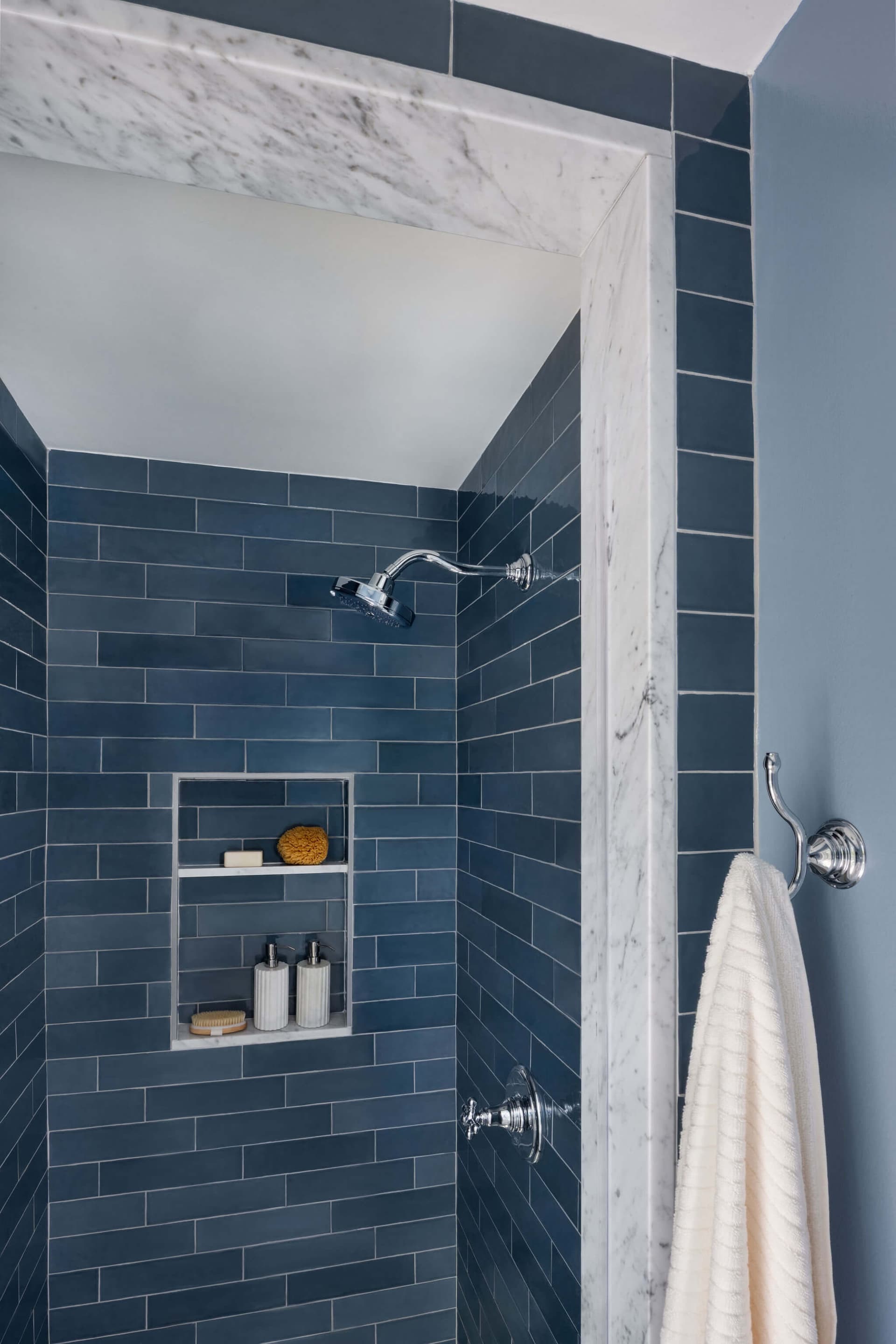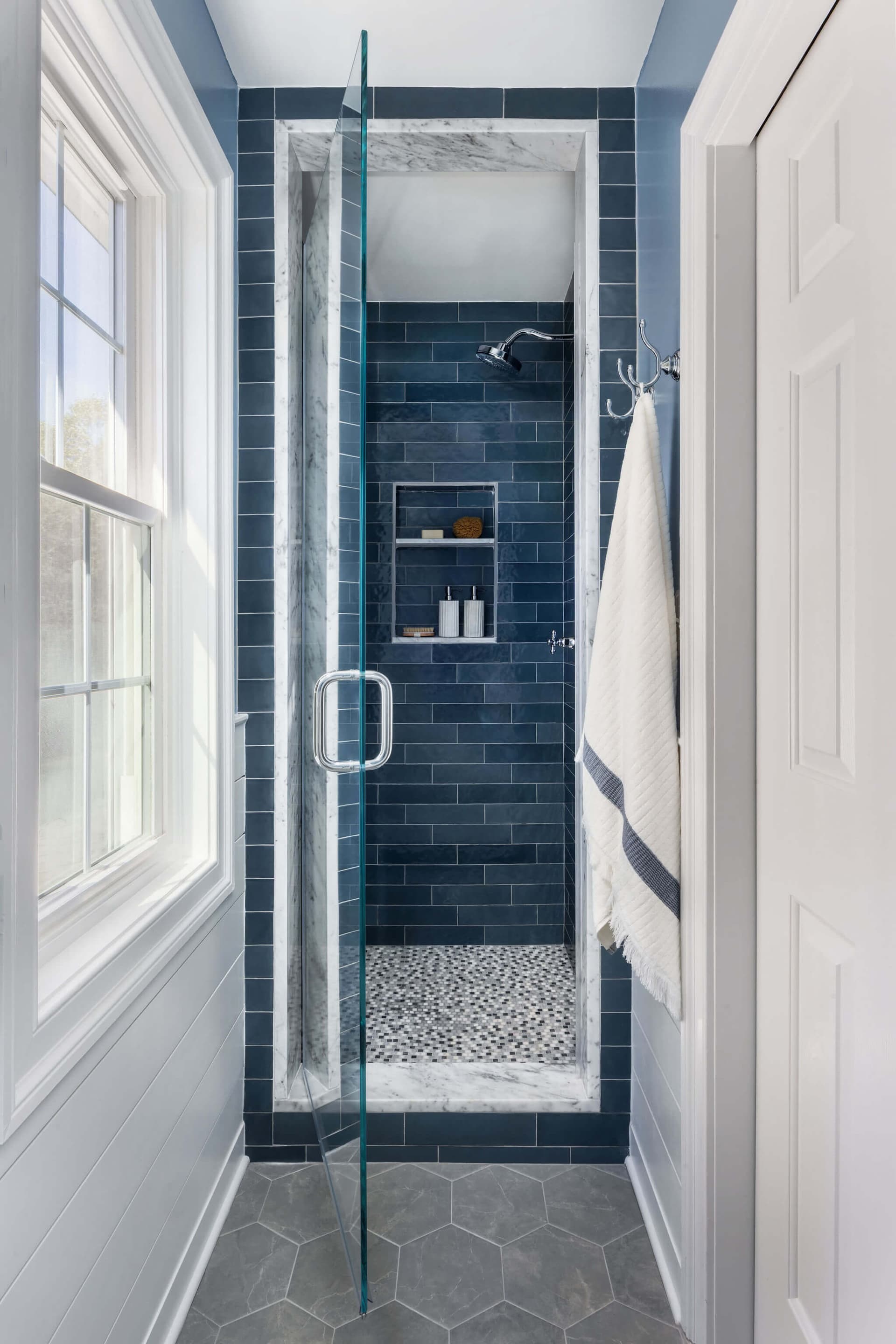 In the second bathroom a narrow shower space is transformed into a striking design moment with deep blue subway tile wrapping the walls. White Carrara marble jambs frame the shower opening, adding a classic contrast to the blue tile. The marble mosaic shower floor adds visual interest. Classic polished chrome fixtures, and thoughtful detailing make this shower both bold and timeless.