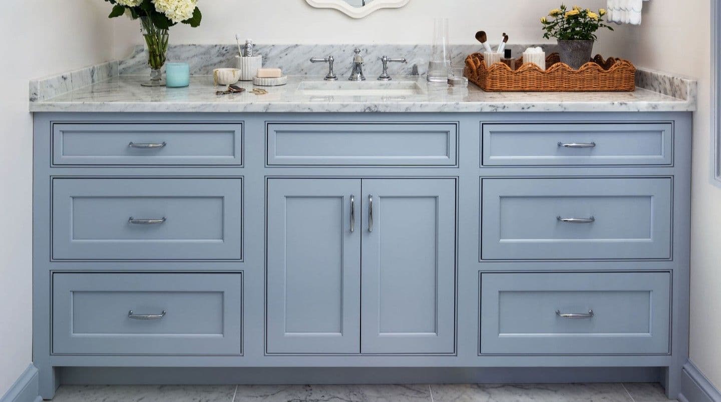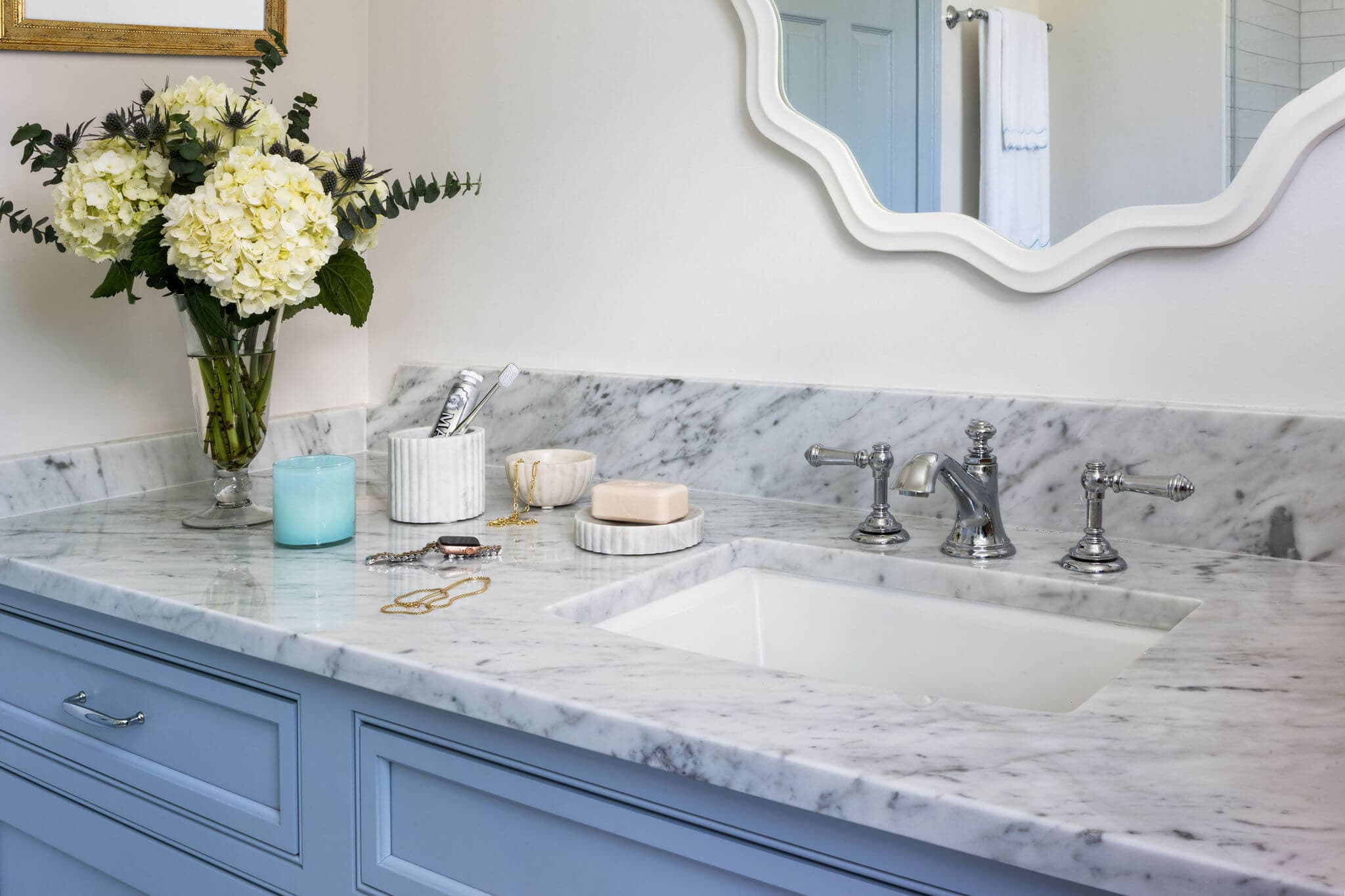 The first bathroom features a charming blue, furniture-style inset vanity that sets the tone for the space. Timeless white Carrara marble spans the floors and countertops, creating a classic foundation. The original tub was transformed into a sleek shower clad in elongated white subway tile. A marble shower floor and niche with subtle blue detailing tie beautifully back to the vanity. Finished with a circular mirror and statement sconces, the space feels both playful and timeless.