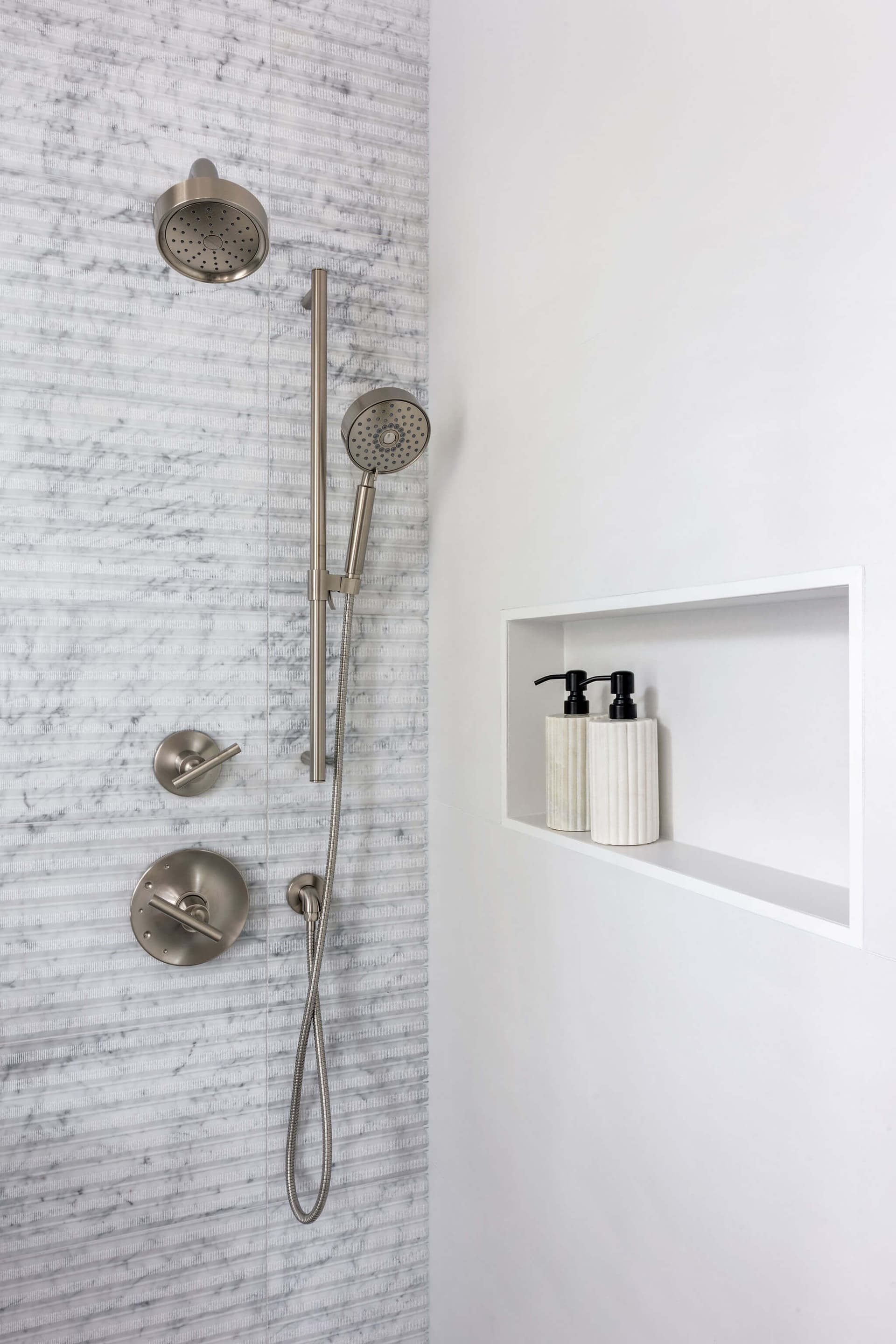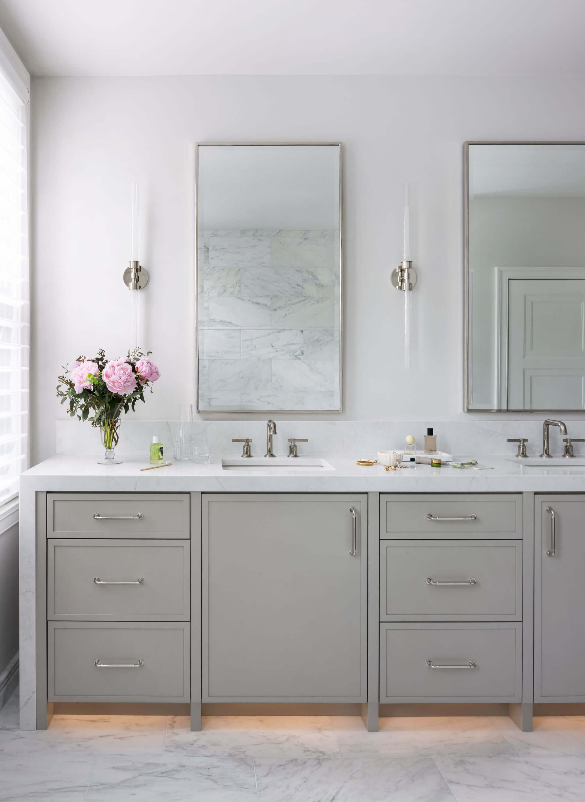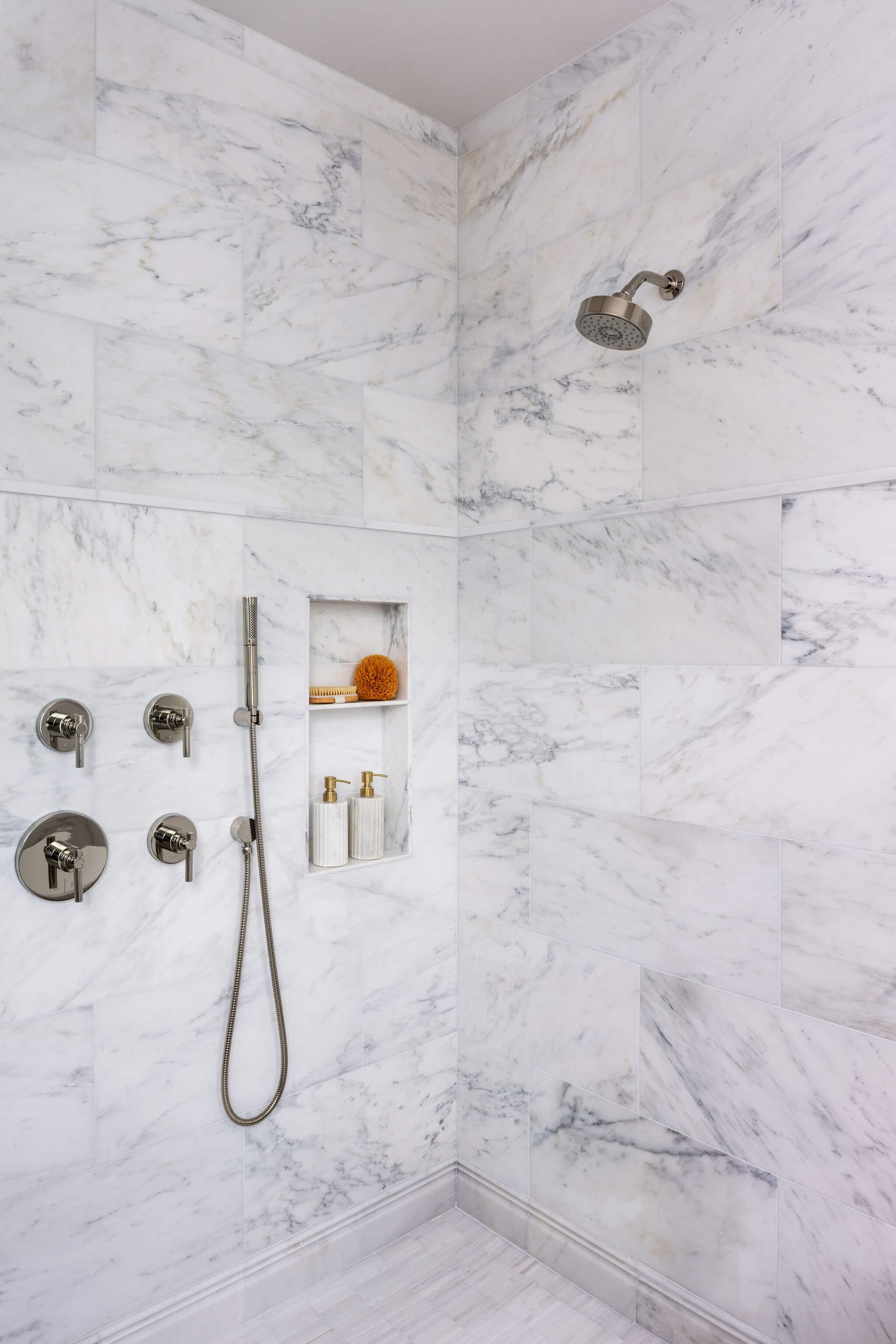 The primary bath was reimaged to fit a double vanity, tall storage cabinets, water closet, a multi-function shower and a soaking tub. Marble, pale gray cabinets, built up waterfall countertops and polished nickel fixtures give the space a calming yet updated feel.
