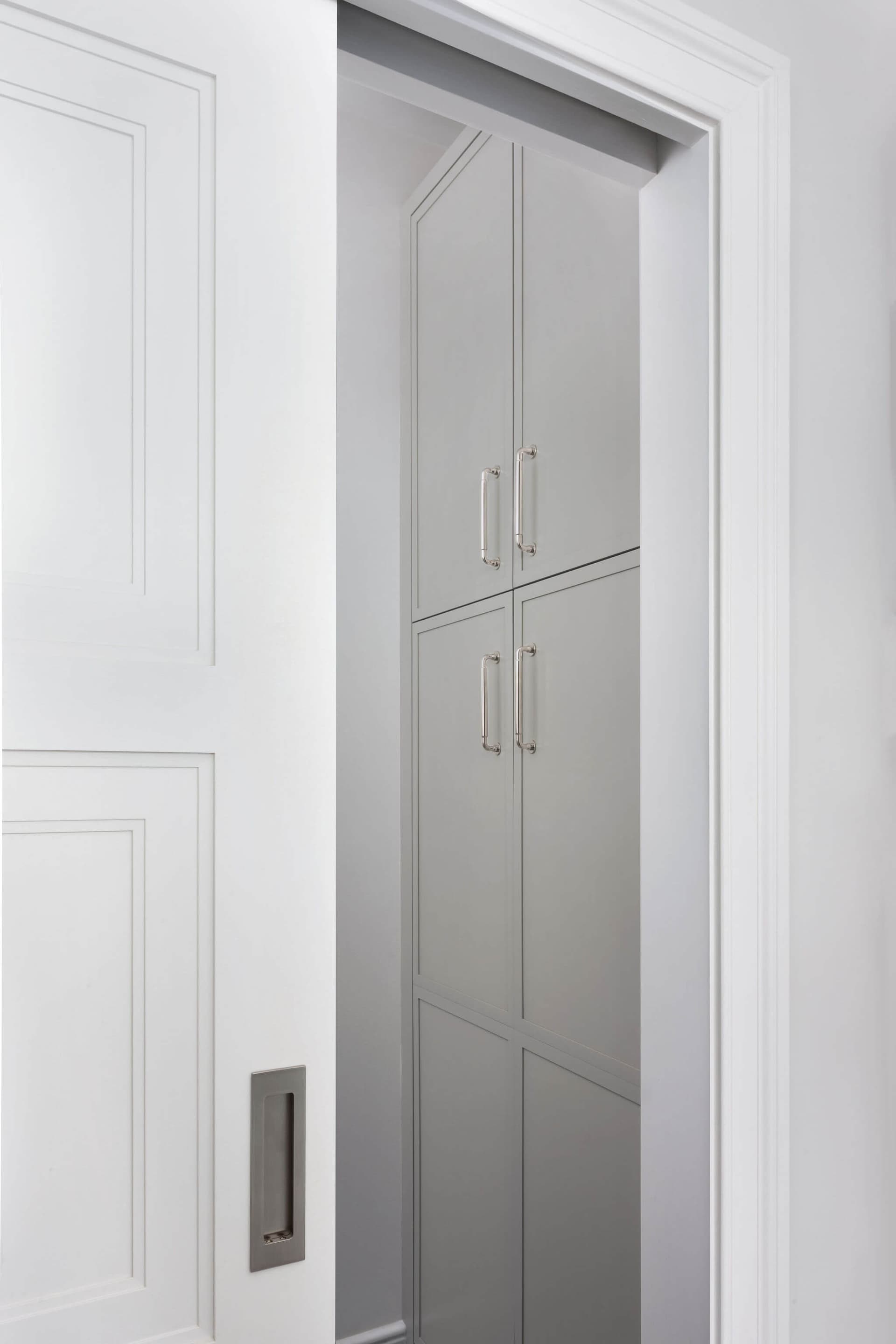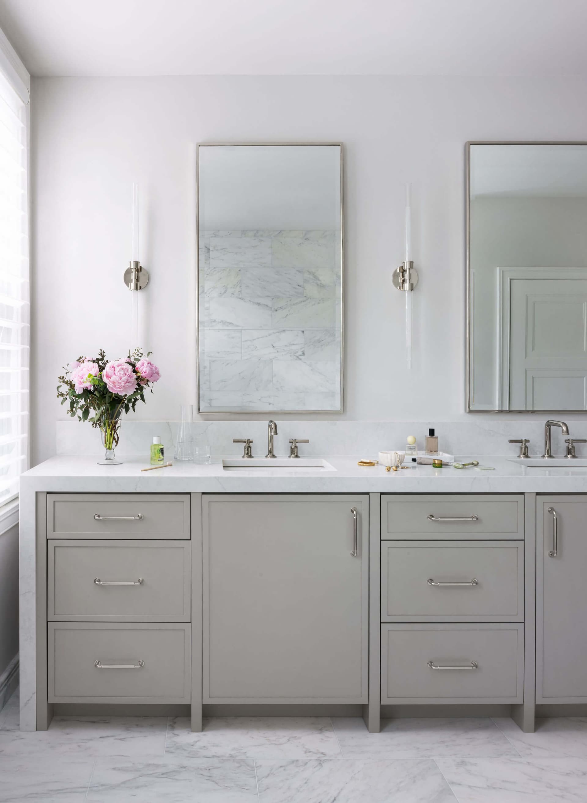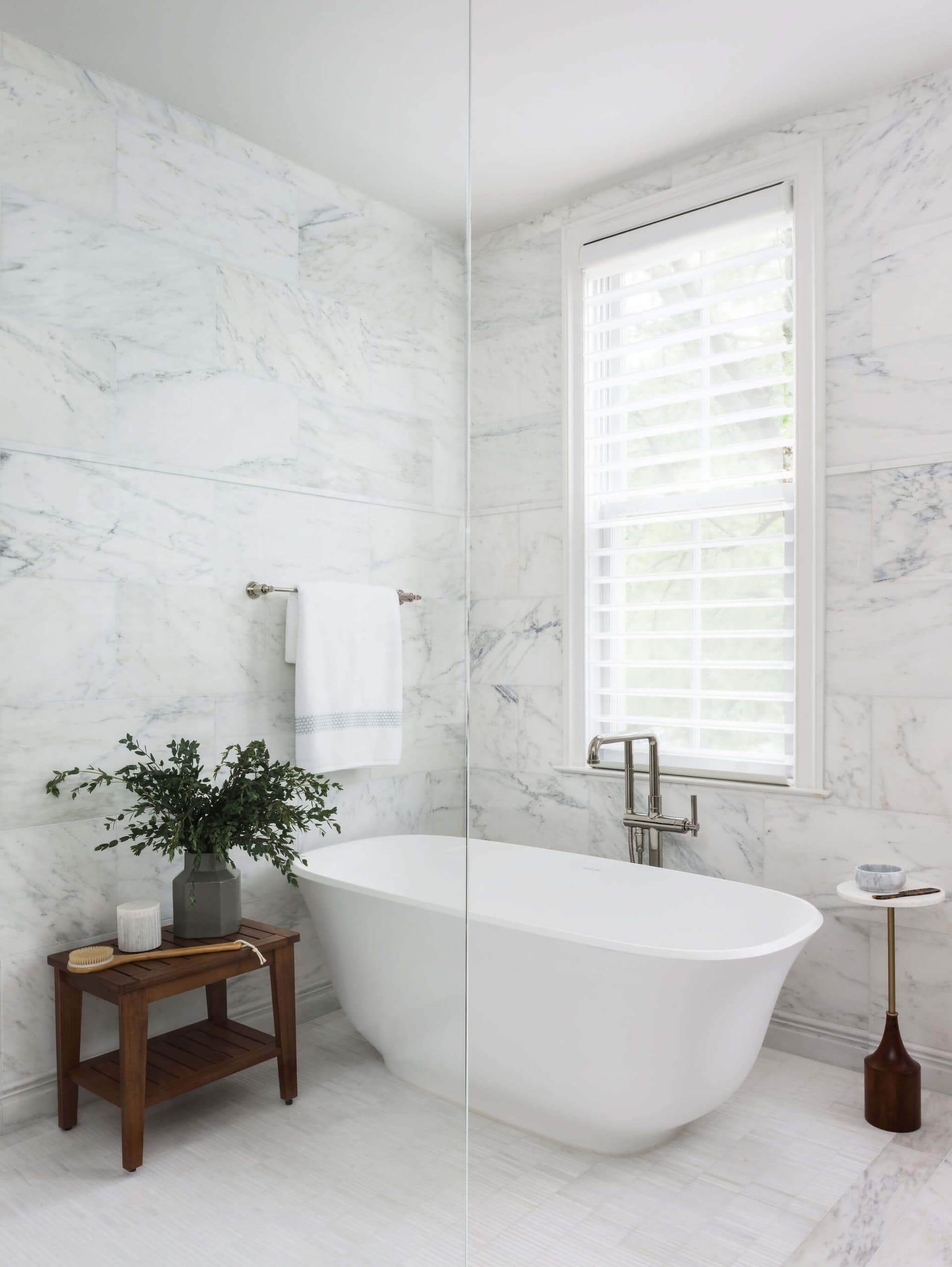 The primary bath was reimaged to fit a double vanity, tall storage cabinets, water closet, a multi-function shower and a soaking tub. Marble, pale gray cabinets, built up waterfall countertops and polished nickel fixtures give the space a calming yet updated feel.
