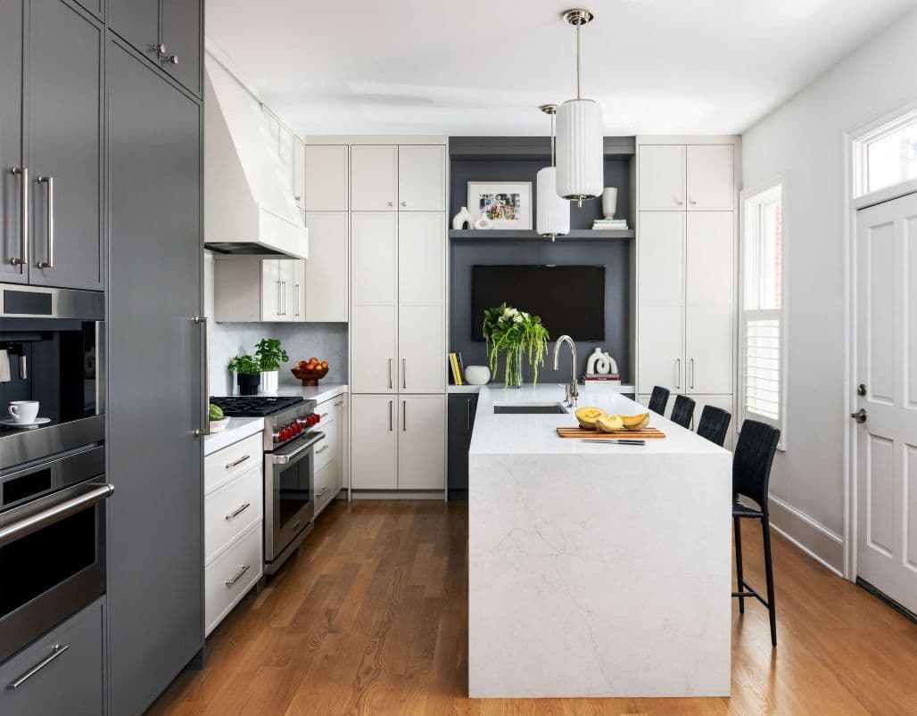 Even Georgetown’s largest townhomes come with space constraints. In this complete gut remodel we took a previous quick flip with no heart and transformed it into an elegant home. Thoughtful space planning in the kitchen allowed for a large peninsula with seating and ample room for storage and prep work. The built in coffee maker and steam oven are flanked by a Subzero freezer and refrigerator. The transitional style and materials compliment the historic home but give the updated feel the client desired.