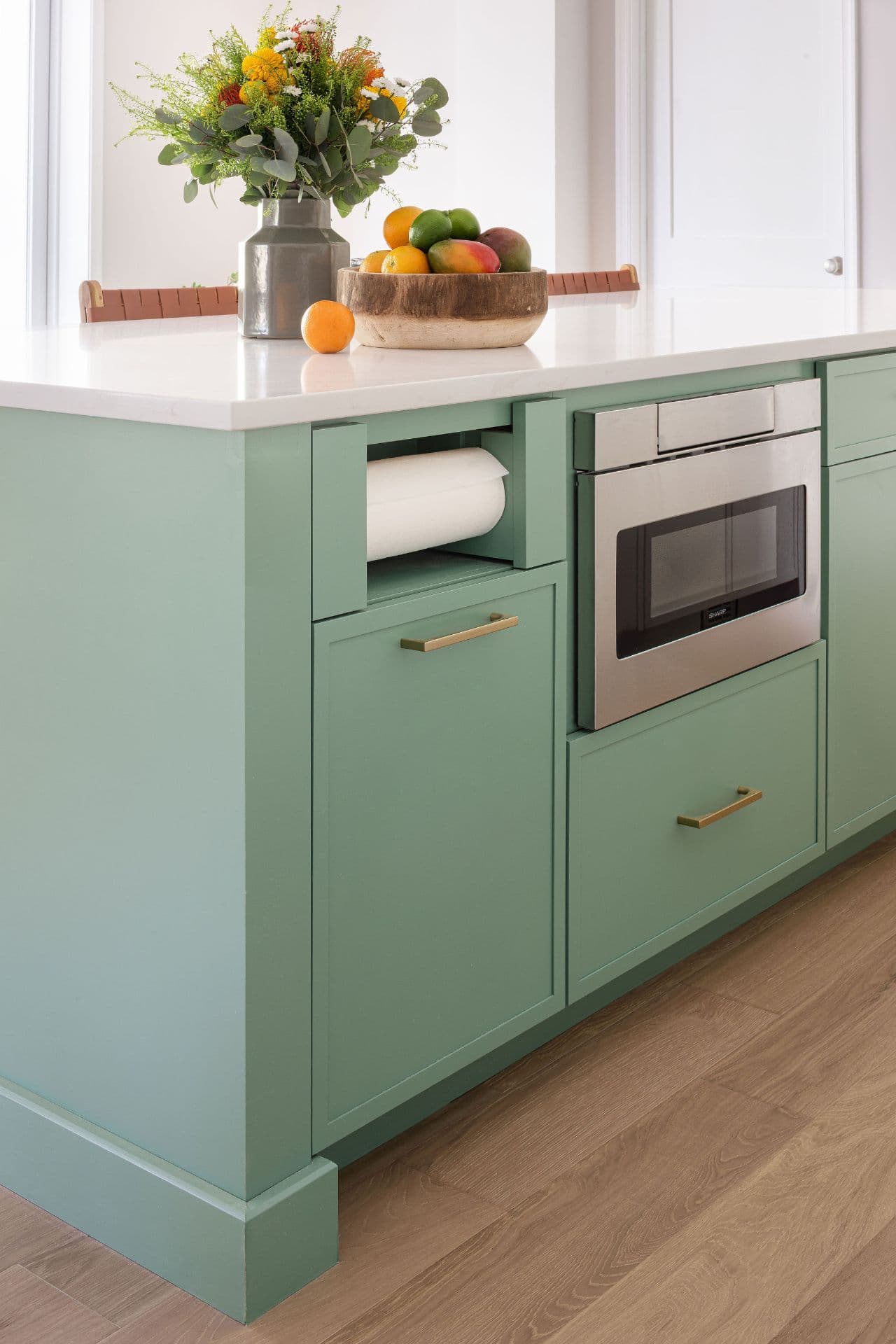 This unfinished basement was a blank slate. The rear patio was uninspiring. Our clients wanted a comfortable space for visiting family as well as a casual hangout spot. We delivered both with a thoughtfully designed in-law suite, a stylish kitchenette, and a spacious lounge area. Floating shelves keep each room feeling open and airy. The high ceilings gave us freedom to play with color. The bold powder room wallpaper and the fresh green island add personality and charm, making the suite as fun as it is functional.