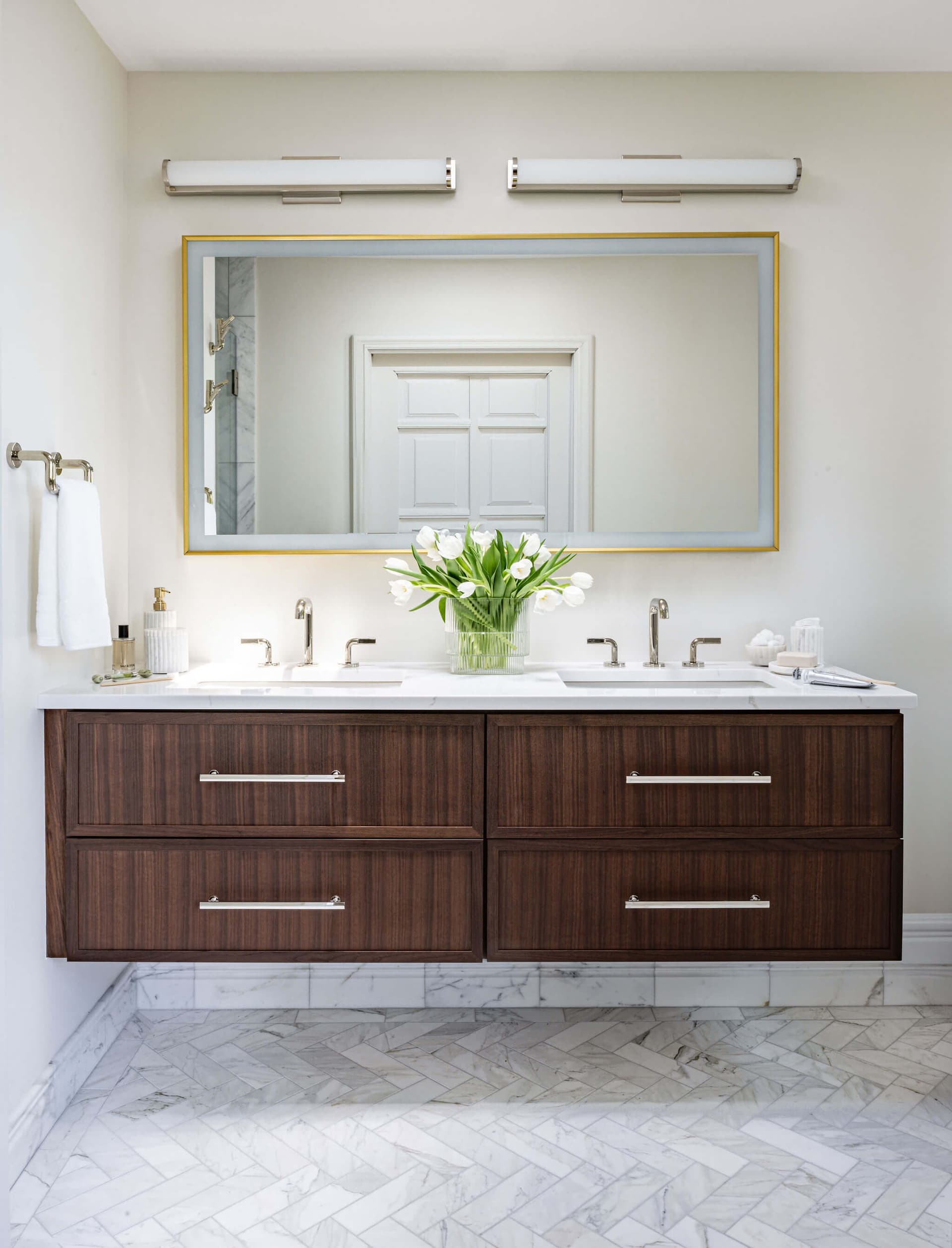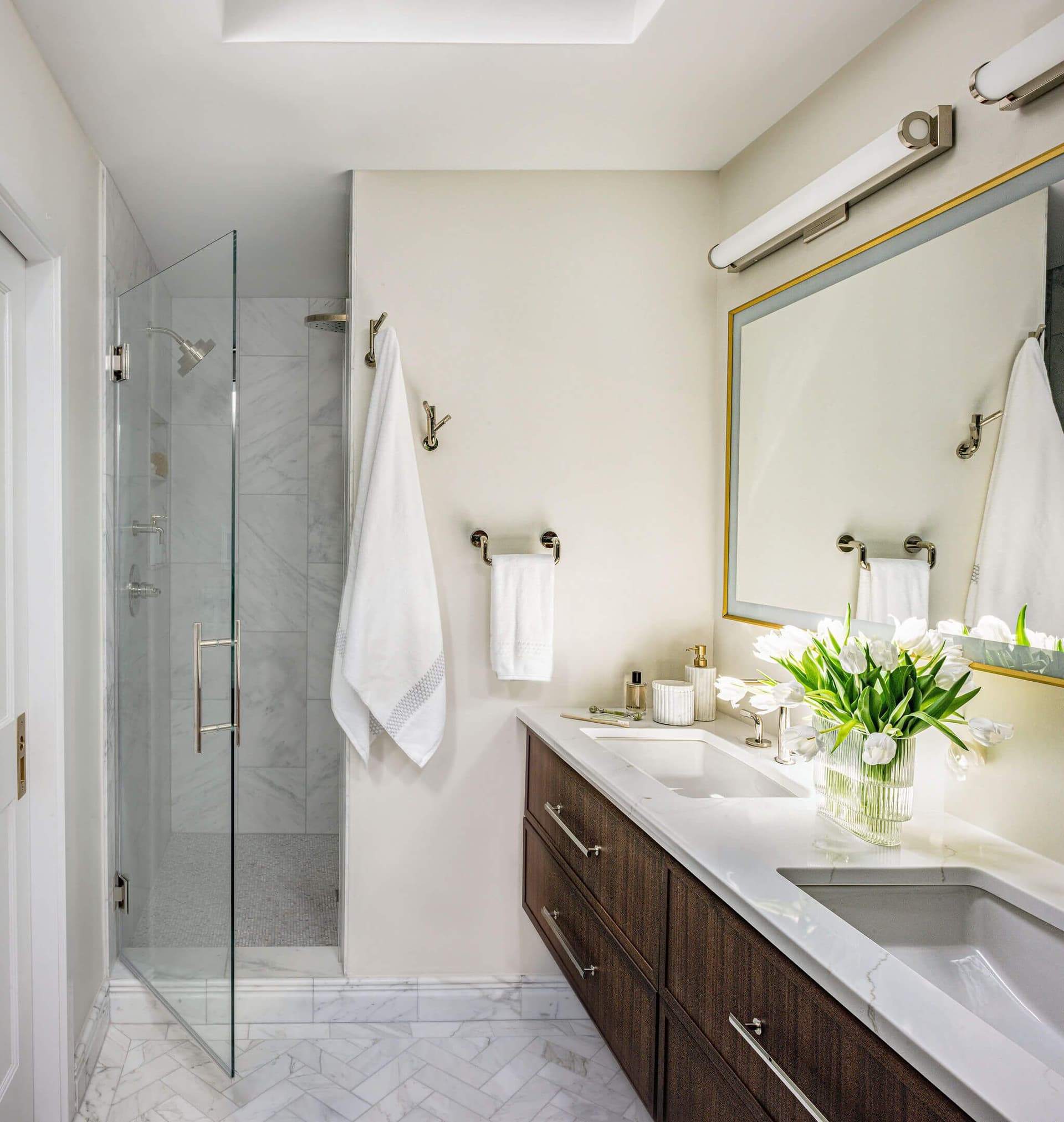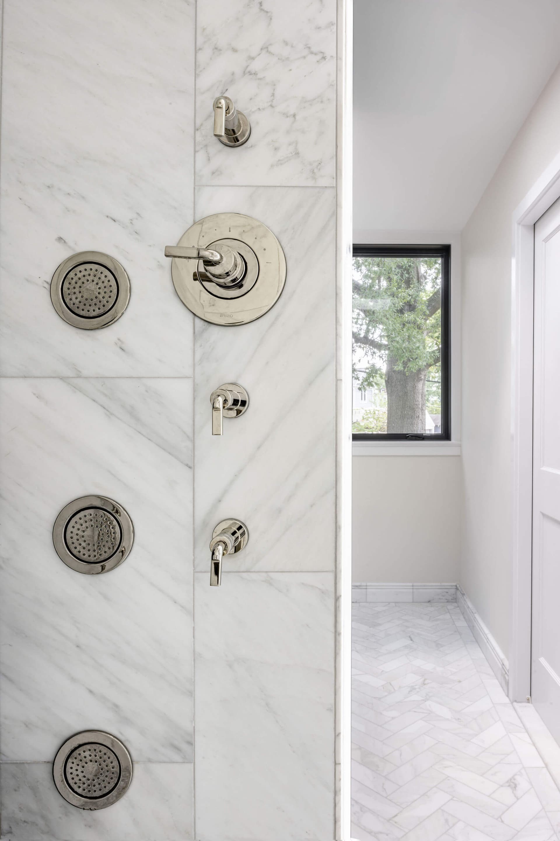 The primary shower features a main showerhead, rainhead, handheld and 6 body sprays for a true spa experience. The marble tile and floating walnut vanity cabinets complete the look.