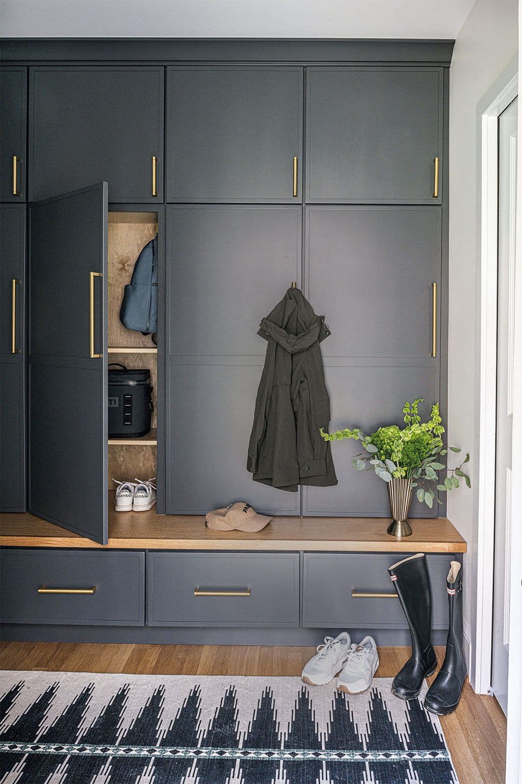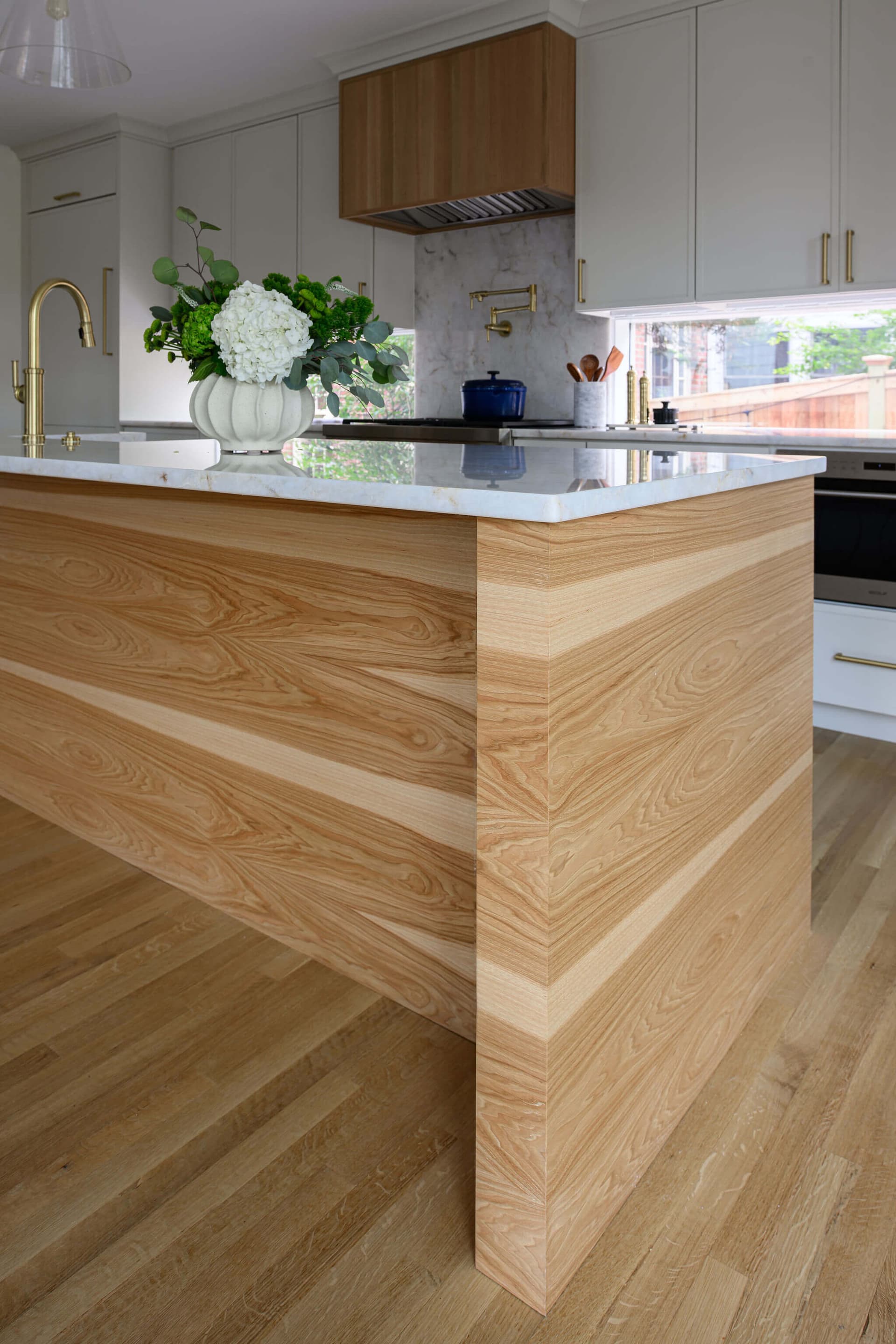 The former kitchen was transformed into a mudroom with charcoal cabinetry; stylish but with plenty of storage. The kitchen features a custom wood hood, unique windows filling the backsplash space, and Subzero/Wolf paneled appliances. The show piece of the kitchen is the stunning horizontal grained hickory island. We worked closely with the cabinet maker on the sourcing and the layout of the panels to achieve the perfect look highlighting the natural grain of the wood.